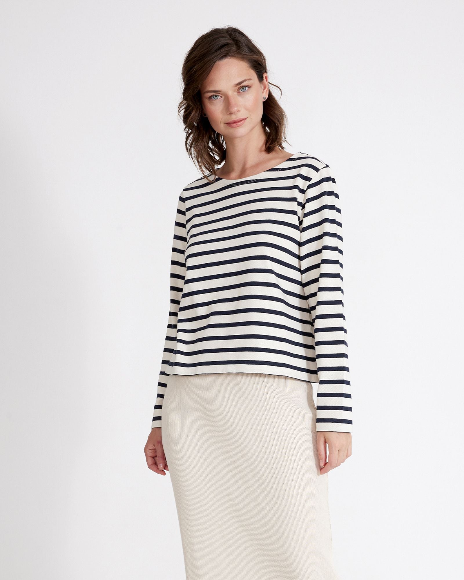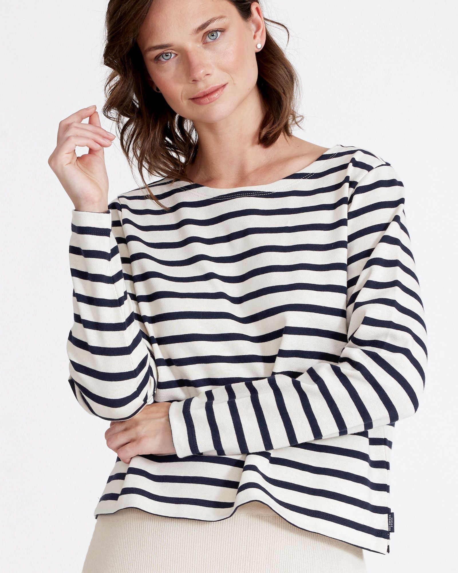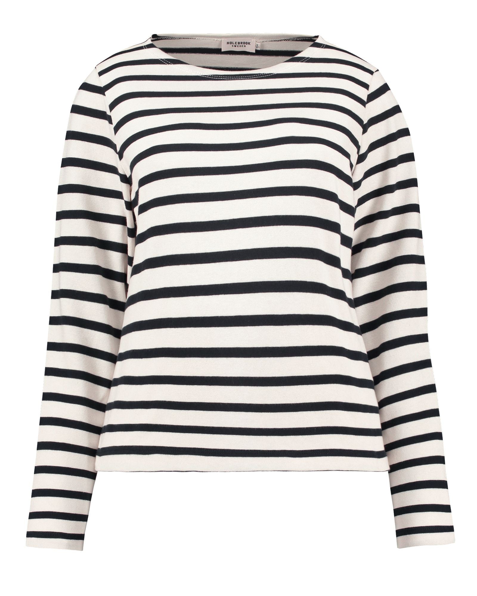 - A classic swater with stripes in cotton. Long sleeves and boat neck. Small slits at sides.