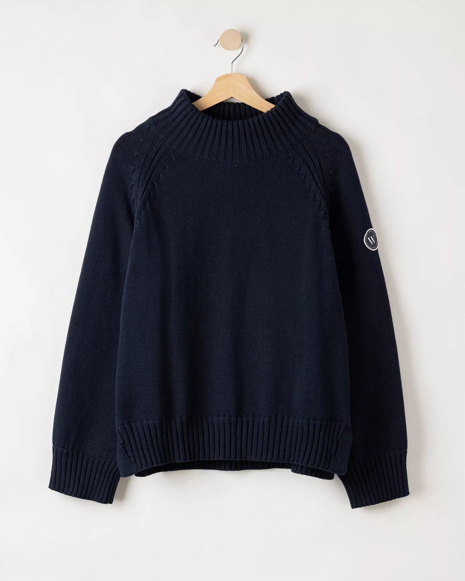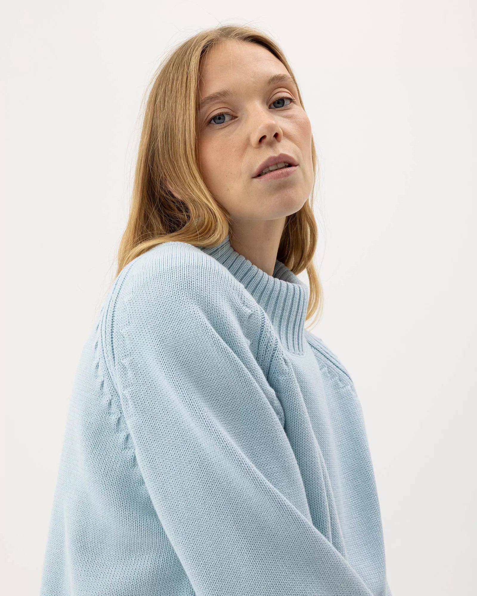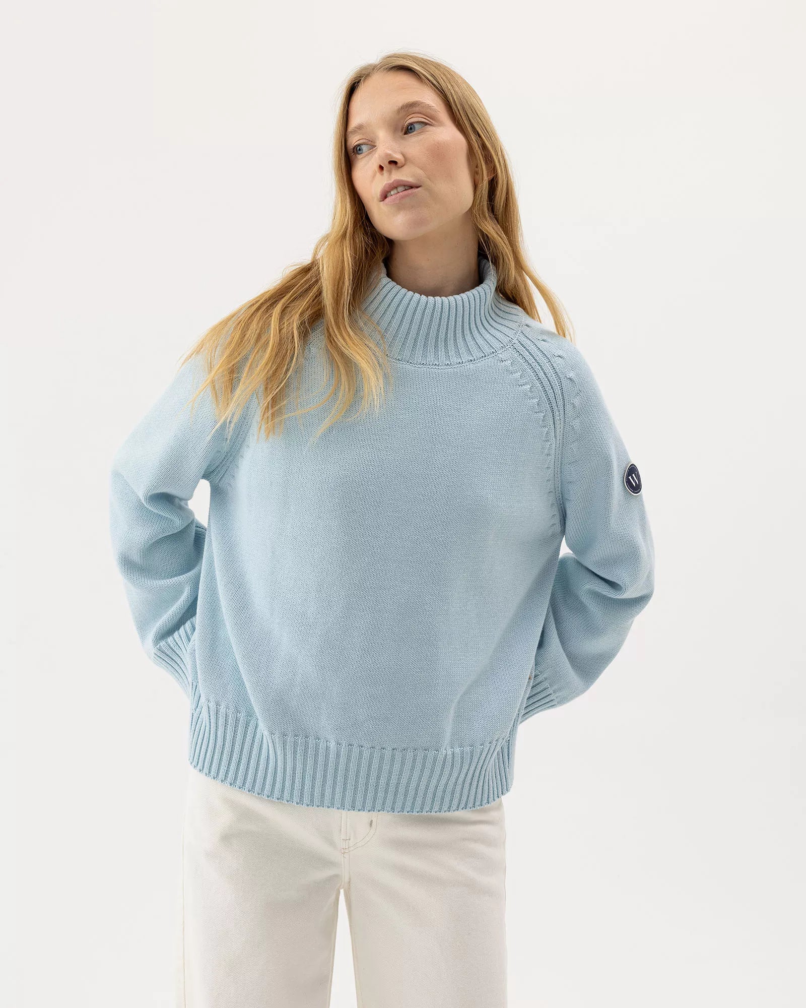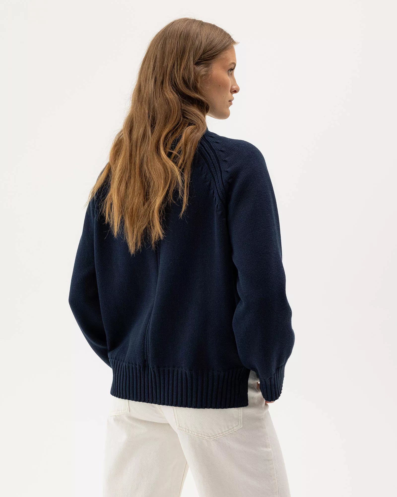 - Windproof knitted turtle neck in organic cotton. Relaxed fit with raglan sleeves and fully fashion details. Rib knitted endings. Sustainably produced in Europe.